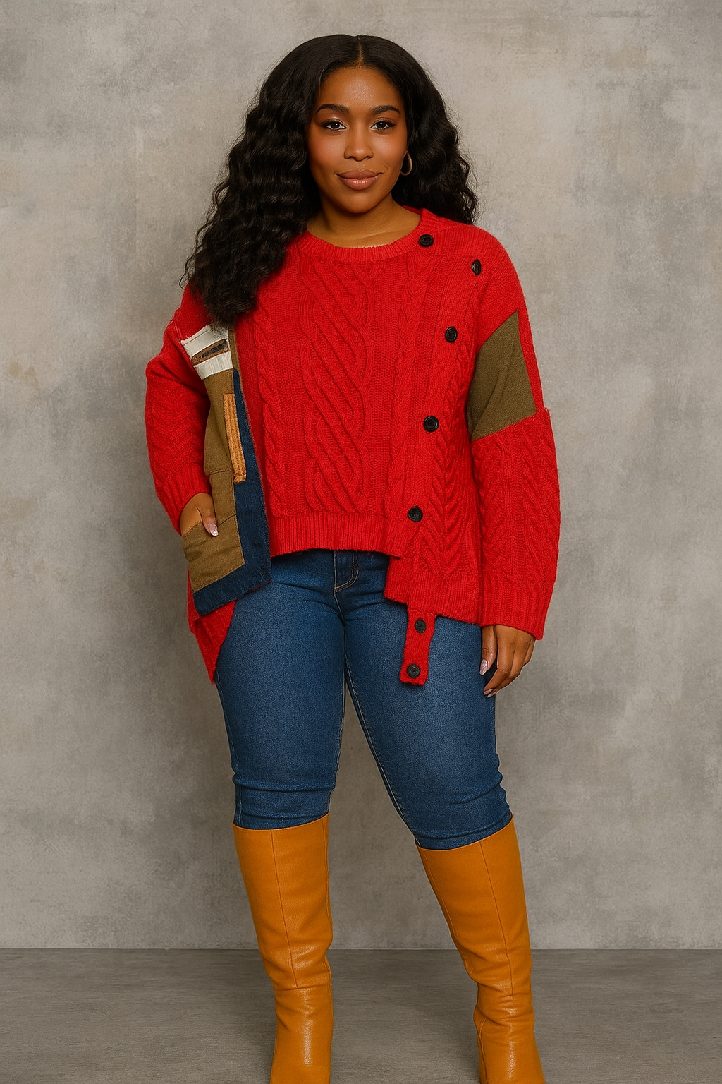 Step into Fall/Winter 2025 with our Cream Patchwork Cable Knit Button Sweater. Featuring cozy cable textures, asymmetrical button accents, and statement patchwork sleeves. Pair with high-waist jeans and tan boots for a neutral slay. Available now at Slay It Again Boutique.