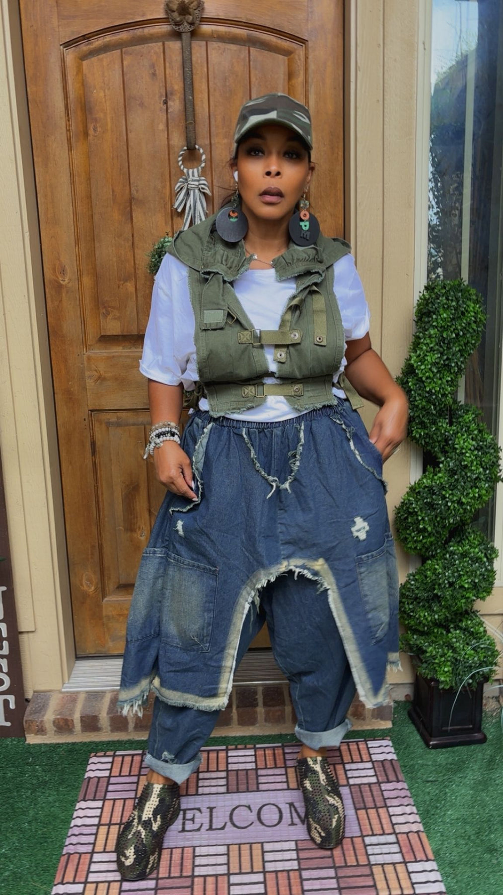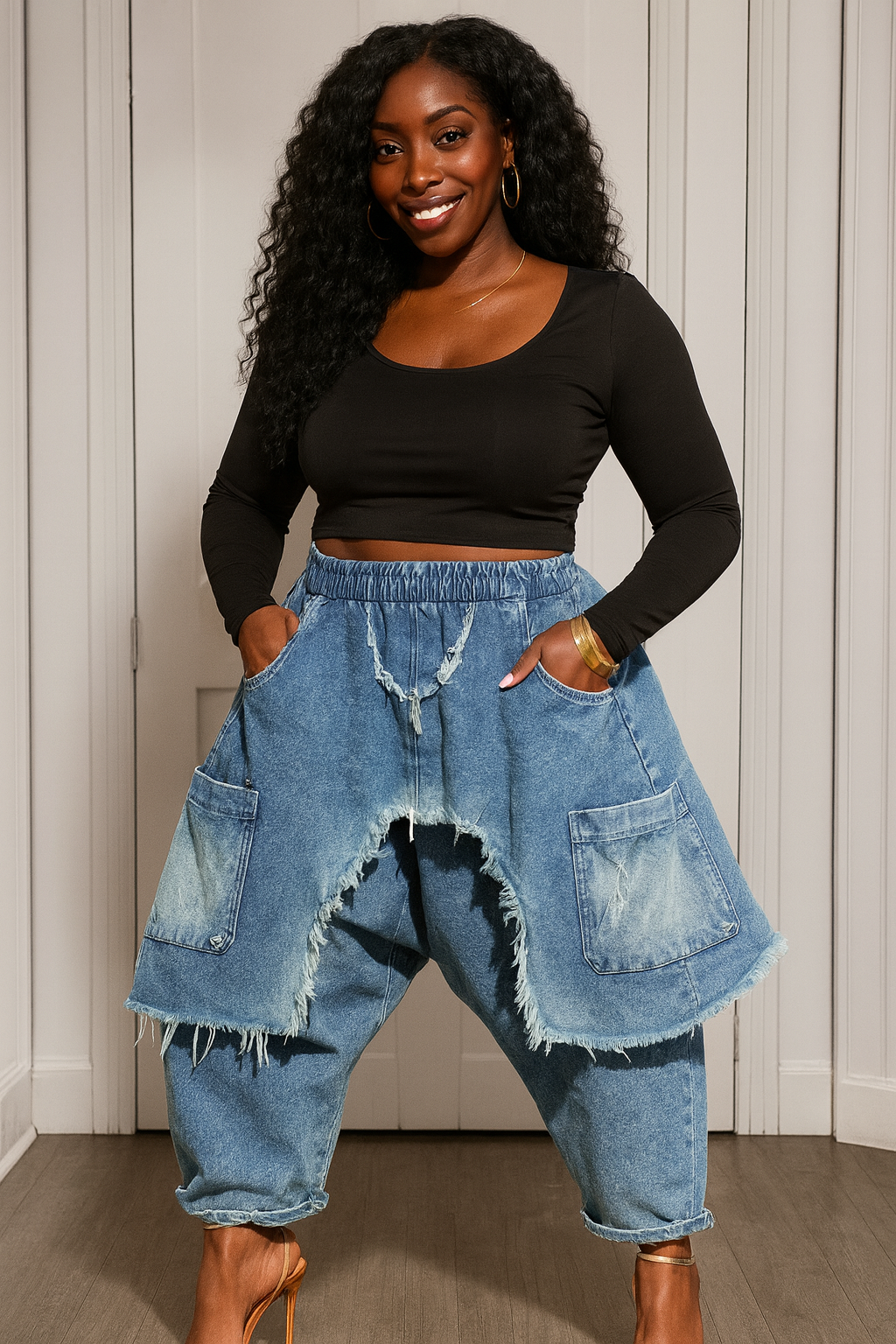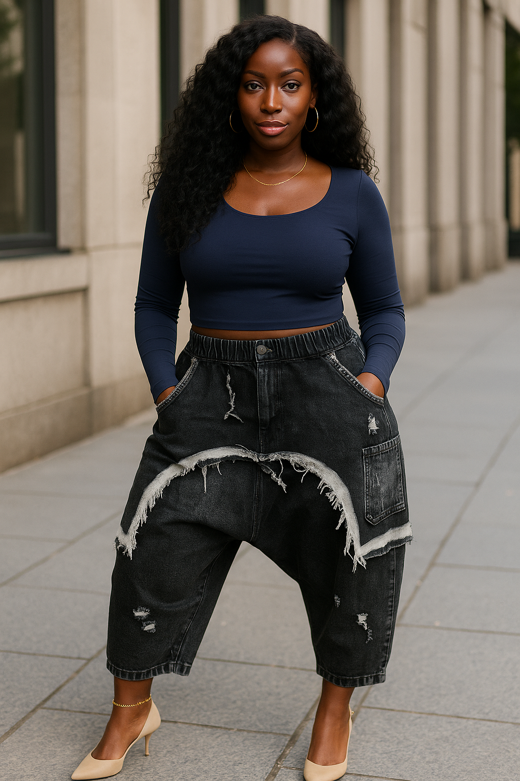 Command attention in these Distressed Drop-Crotch Denim Harem Jeans, designed for the bold and fashion-forward. These statement pants bring a streetwear edge with their oversized silhouette, frayed raw detailing, and unique arched distress design across the front.